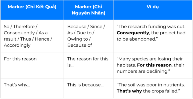 Nhóm markers này giúp bạn xác định mối quan hệ nhân quả giữa các sự kiện hoặc thông tin. Chúng cực kỳ quan trọng trong Section 4, thường là một bài giảng học thuật, nơi người nói giải thích các hiện tượng, quy trình hoặc kết quả nghiên cứu. Nhận diện được các markers này giúp bạn hiểu sâu hơn về lập luận của người nói.